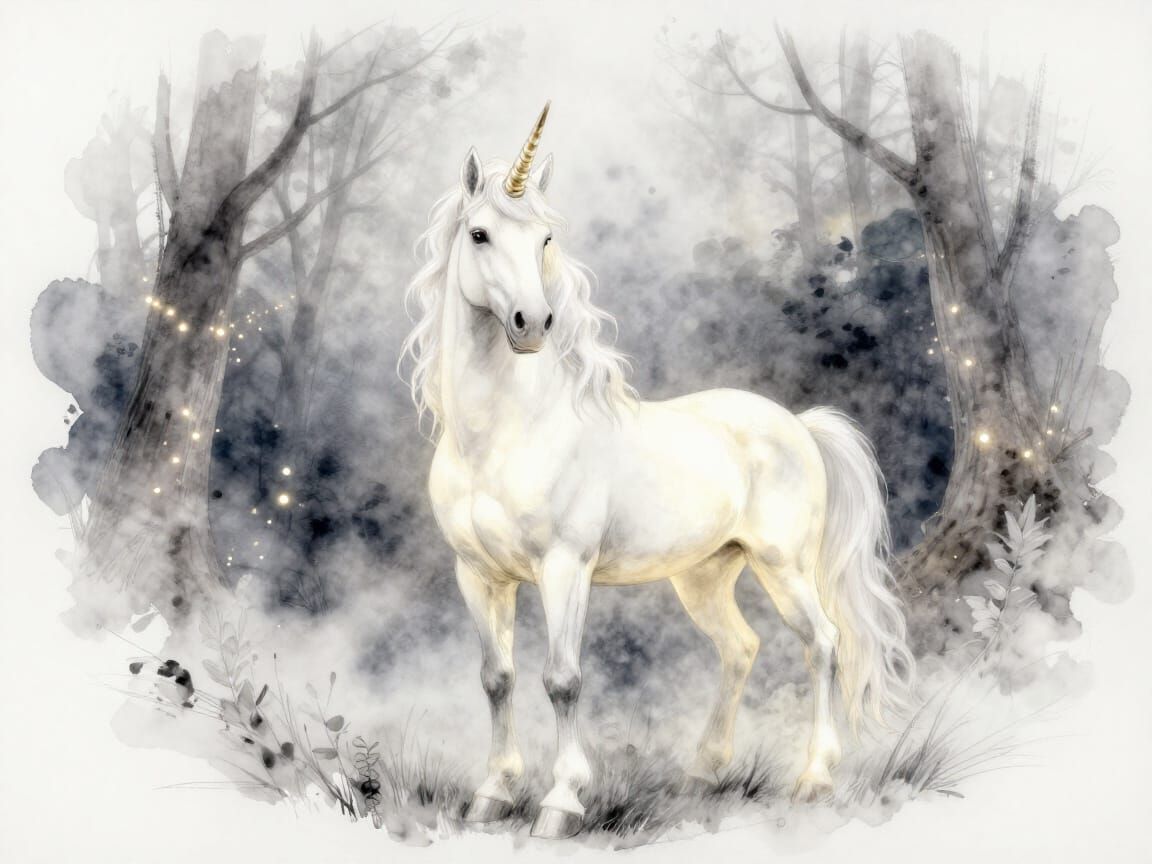 This image shows a majestic, glowing unicorn in a misty forest under moonlight. Drifting light motes and subtle rim lighting enhance its ethereal presence, rendered in a watercolour expressionism style.