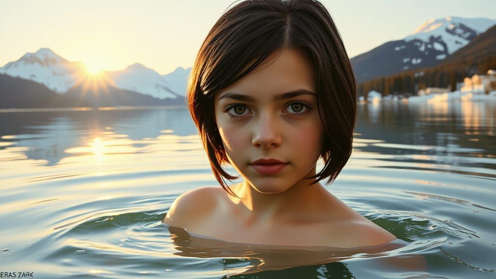 This image shows a head and shoulders portrait of a green-eyed girl bathing in a lake. The oil painting on canvas captures warm light and snow-covered mountains with vibrant colors in a realistic style.