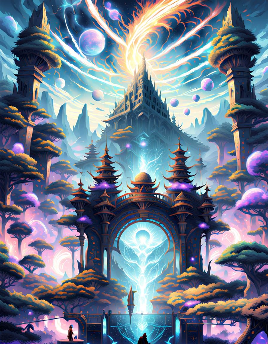 This anime illustration depicts a massive, ornate gateway radiating ethereal light in an alien world. Features shimmering energy, celestial patterns, and vibrant blues and purples.
