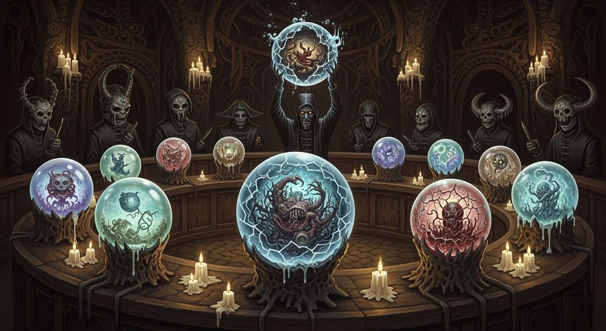 This image shows a candle-lit auction in a subterranean chamber, featuring masked figures bidding on crystal orbs containing dreamscapes. The scene is rendered in a dark, macabre style with surreal, biomechanical aesthetics.