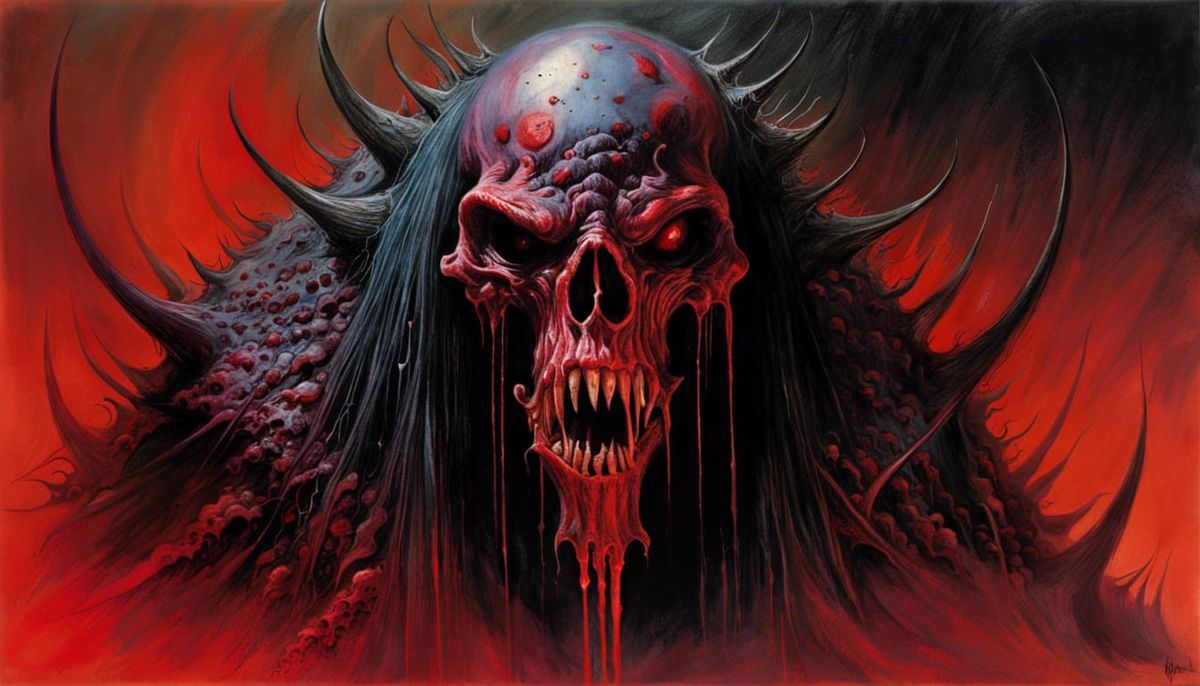 This image shows a hyperdetailed horror concept art piece of a bloody, gothic creature embodying pure hate. The artwork evokes the style of dark fantasy illustrators.