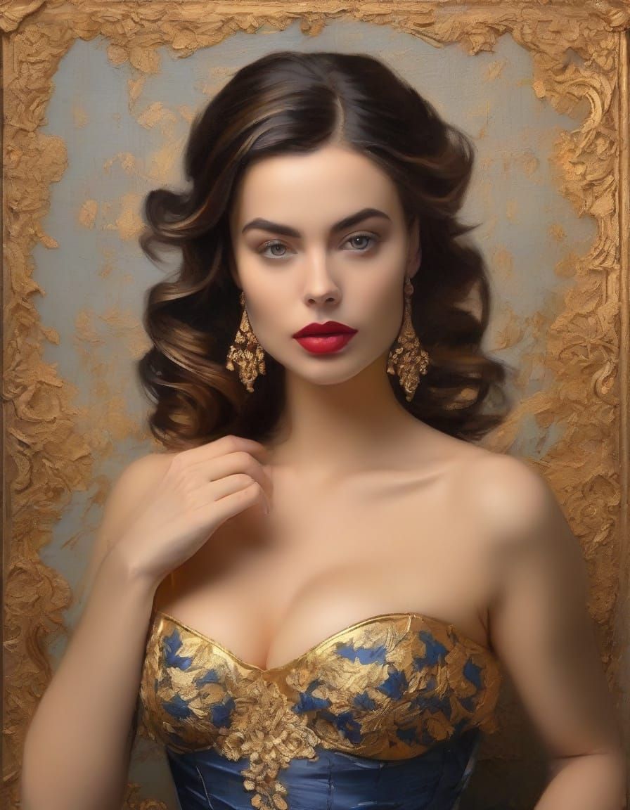 This image shows a young woman in a lavish boudoir, surrounded by opulent details and rich, jewel-toned colors, in a style reminiscent of a high-end gouache illustration with thick, impasto brushstrokes and intricate textures.