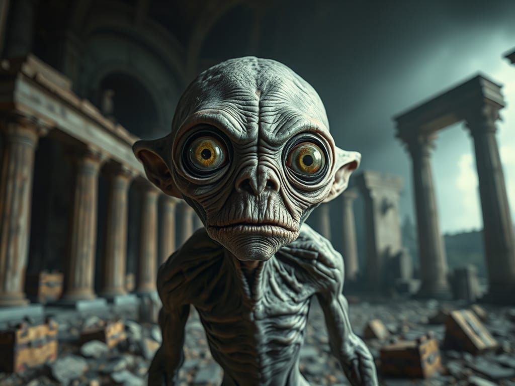 This haunting image depicts a humanoid figure with striking features standing amidst crumbling ancient structures, bathed in dramatic lighting and vibrant colors, blending mysticism and horror in a dark romantic fantasy aesthetic.