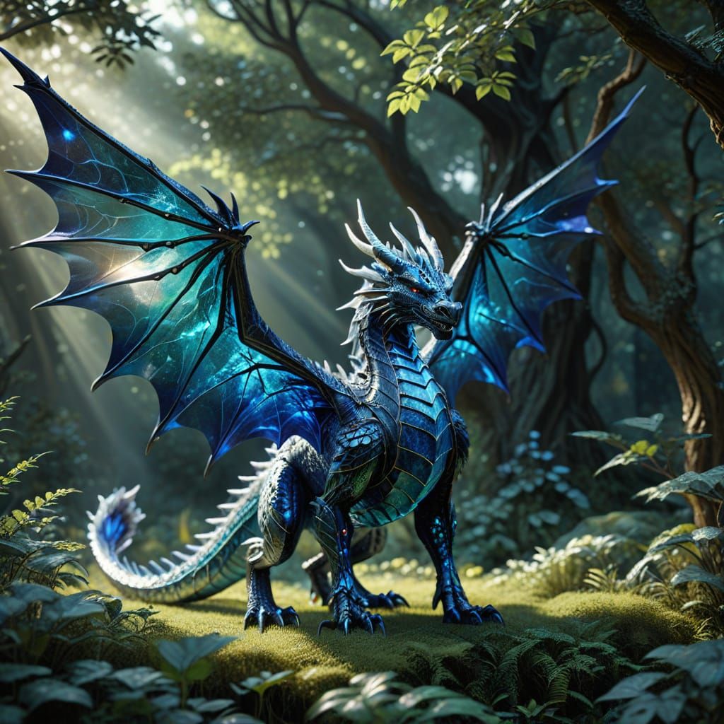 This image features a majestic, full-body view of a legendary blue dragon crafted from stained glass and transparent glass, set against a serene background with intricate details and soft white tones, creating a cinematic and atmospheric scene.