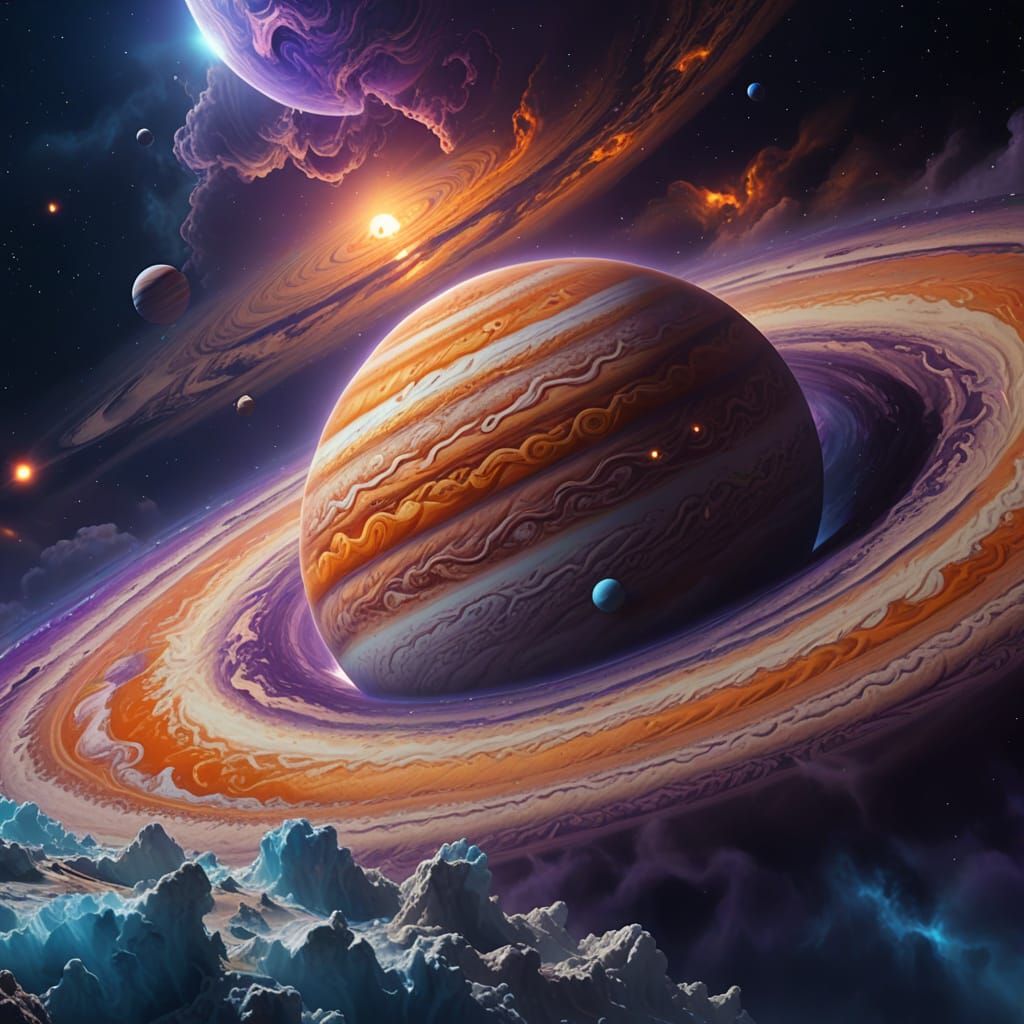 A vibrant digital artwork of Jupiter's atmosphere with swirling storm clouds and icy blue rings. The image features glowing purple clouds, turbulent orange mist, and soft gradient lighting in an anime style.