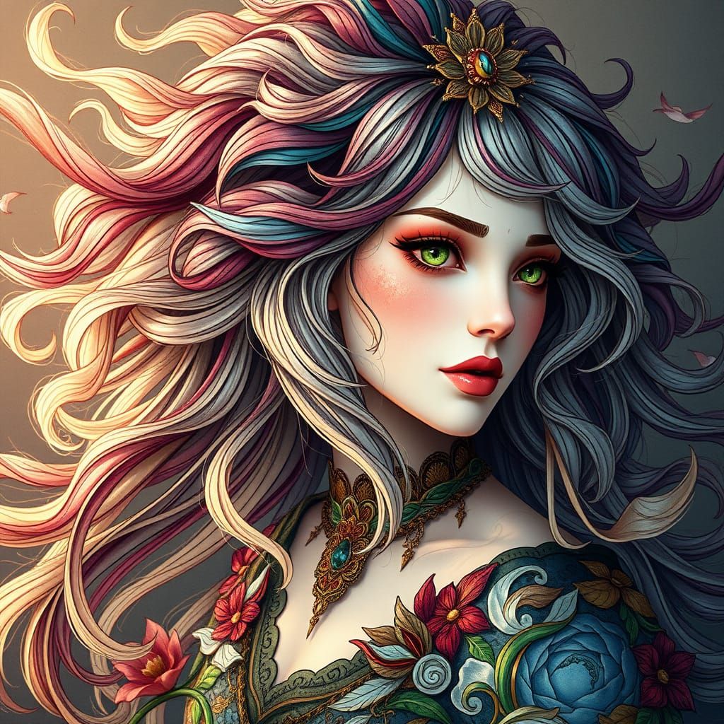 This enchanting portrait depicts a mythical flower-like woman, Alraune, with super long, wavy, split-colored hair adorned with delicate flying petals. Her ornate attire features intricate stained glass and watercolor-inspired textures, with bold lines and triadic colors evoking a sense of elegance and re...
