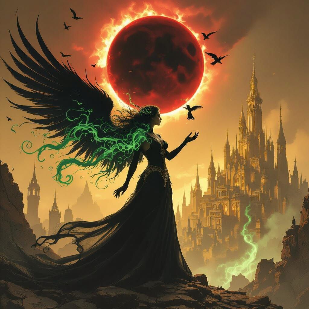 This image shows Donna with smoky wings under a red eclipse, a ruined golden city behind her. Green fire in her hair and ghostly birds complete the dramatic fantasy concept art scene.
