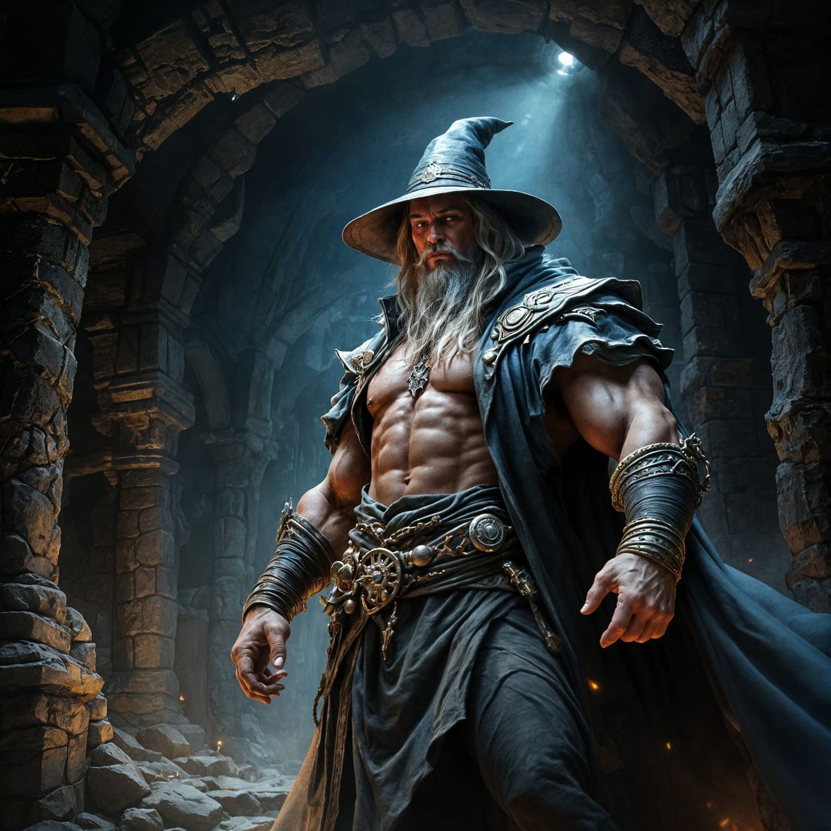 This image shows a powerful wizard in a dungeon setting. The fantasy art style features dramatic lighting to enhance the scene's atmosphere.