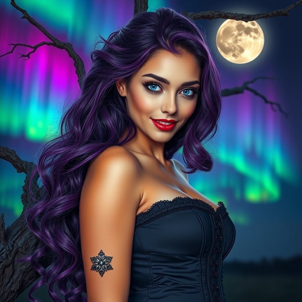 This image shows a woman with classic European features and a mischievous smile, leaning against a decaying tree, bathed in the soft glow of a full moon and colorful aurora, in a photorealistic style reminiscent of atmospheric and detailed art.