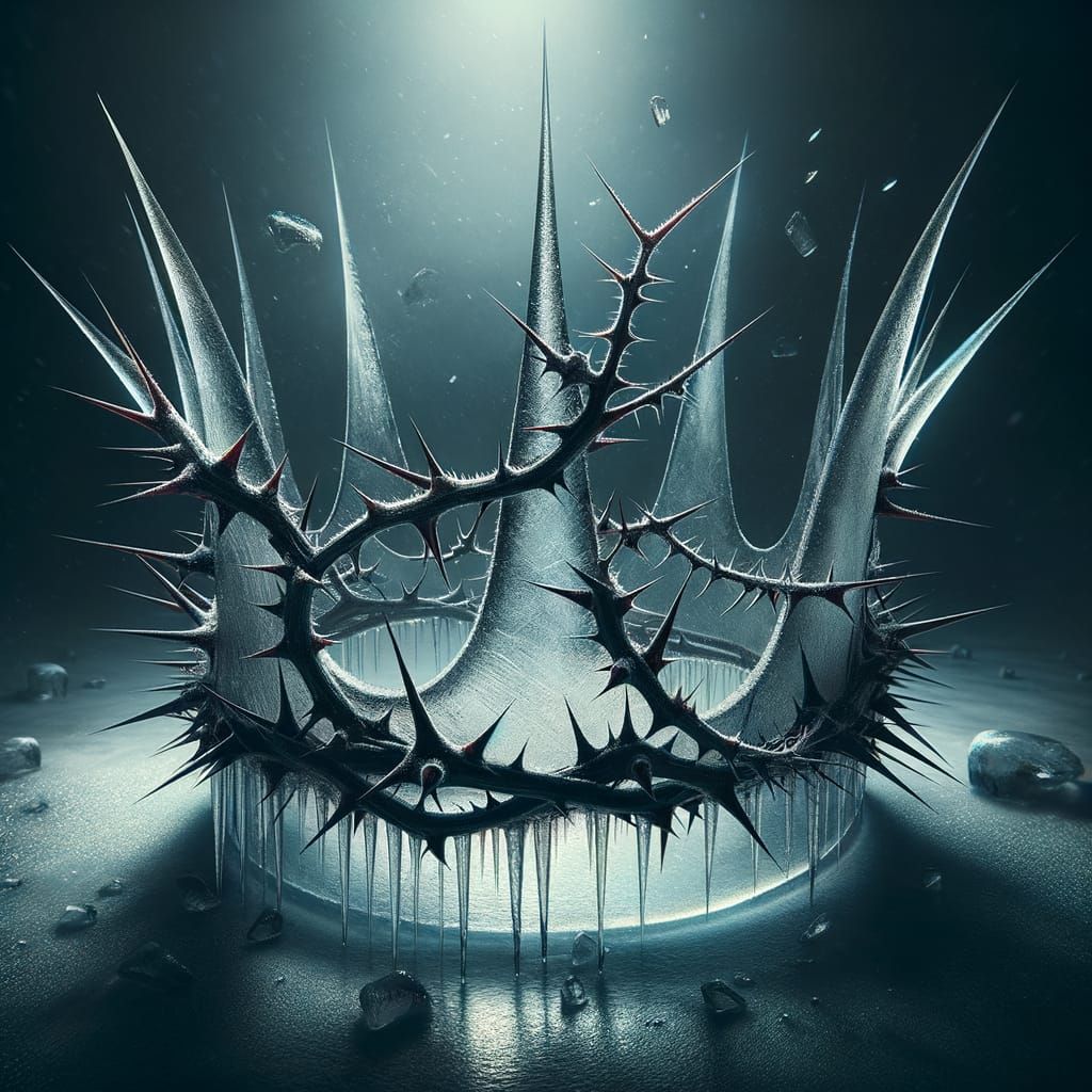 This image depicts a haunting, icy crown shrouded in a dark, ethereal night sky. Sharp thorns are wrapped in sleek ice crystals, refracting dim light and a subtle crimson hue, evoking a sense of macabre royalty.