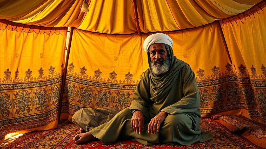 A serene image of a Muslim man and woman in traditional attire, sitting together in a cozy, vintage tent, surrounded by warm, golden lighting and intricate Middle Eastern patterns.