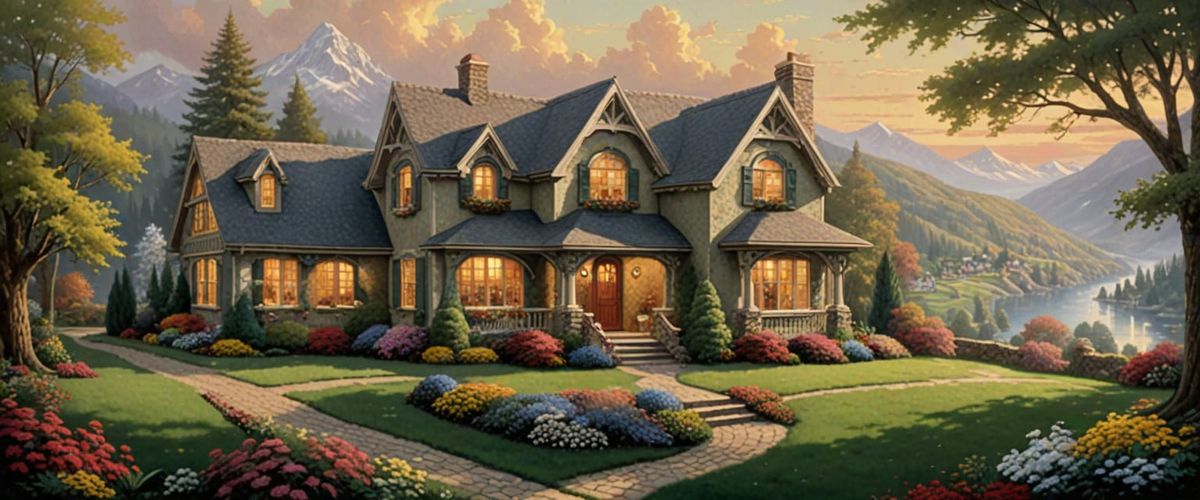 Generate beautiful, idyllic house images in the style of Thomas Kinkade. Free and easy to use!