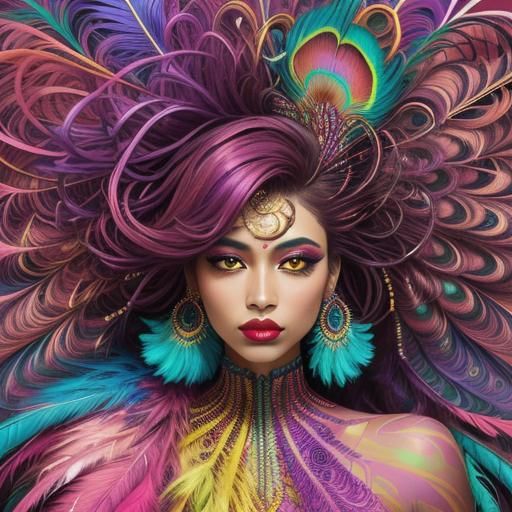 A striking picture of a woman with peacock feathers in her hair, set against an abstract background. The portrait is rendered with bold brushstrokes and vibrant, complementary colors in an abstract expressionist style.