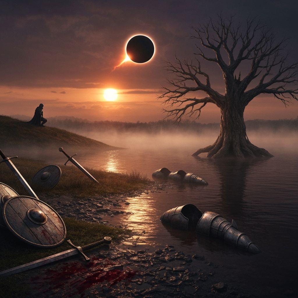 A cinematic, wide-angle view of a desolate dark fantasy battlefield during a solar eclipse. Features a misty lake, ancient tree, and collapsed armor, rendered in gritty, hyper-detailed concept art with dramatic lighting.