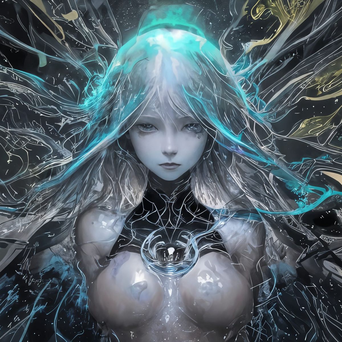 This image shows a beautiful female figure in silhouette, surrounded by a galaxy with dripping nebulae and a textured sky with soft, classical lighting, all rendered in a hyperdetailed, maximalist style reminiscent of surrealist art