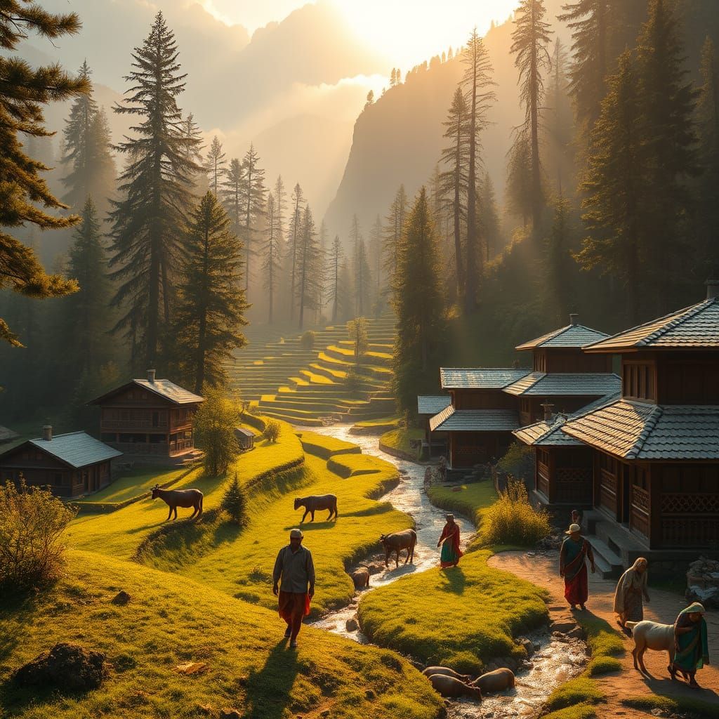 This image shows a picturesque village nestled in the misty Himalayas, surrounded by towering pine trees and lush green fields. Traditional wooden houses and vibrant villagers create a peaceful ambiance, contrasting with the ominous Dark Cave in the distance.