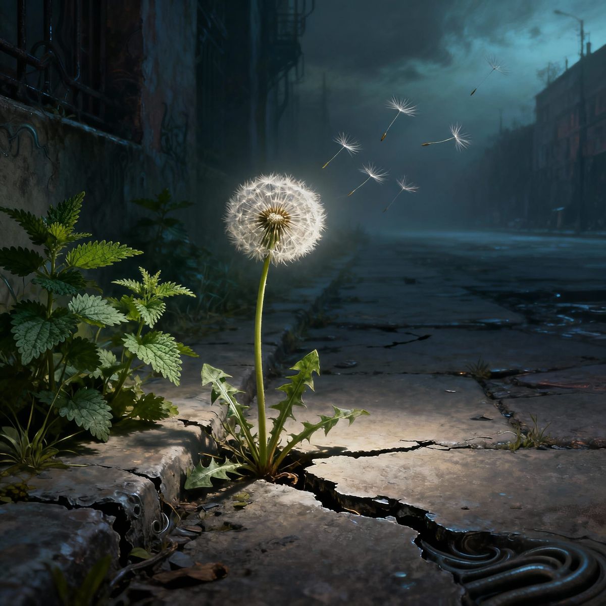 This image depicts a resilient dandelion growing from cracked pavement with stinging nettles, bathed in ethereal light. A digital painting with dramatic lighting.