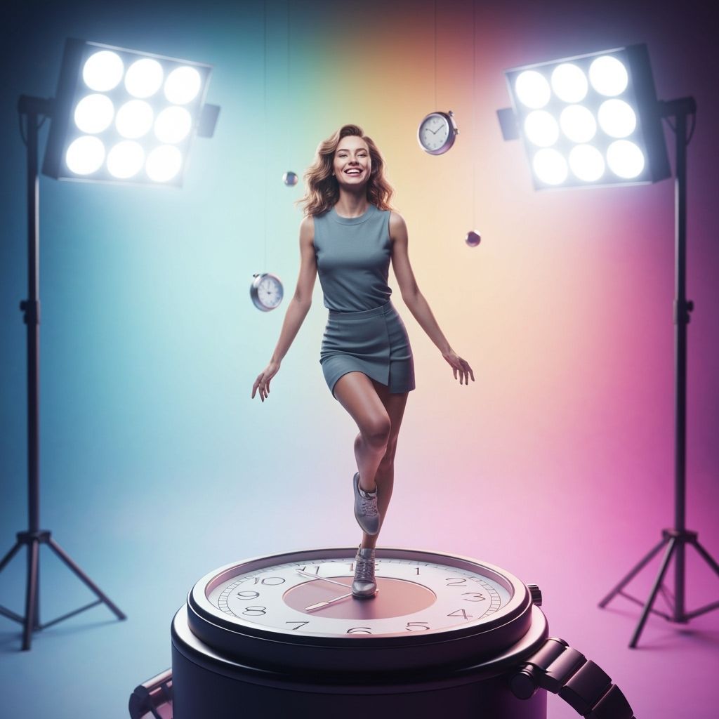A hyperrealistic image of a smiling Slavic woman in high fashion, floating with a luxury clock. Features cinematic lighting and a surreal, avant-garde aesthetic with vibrant gradients.