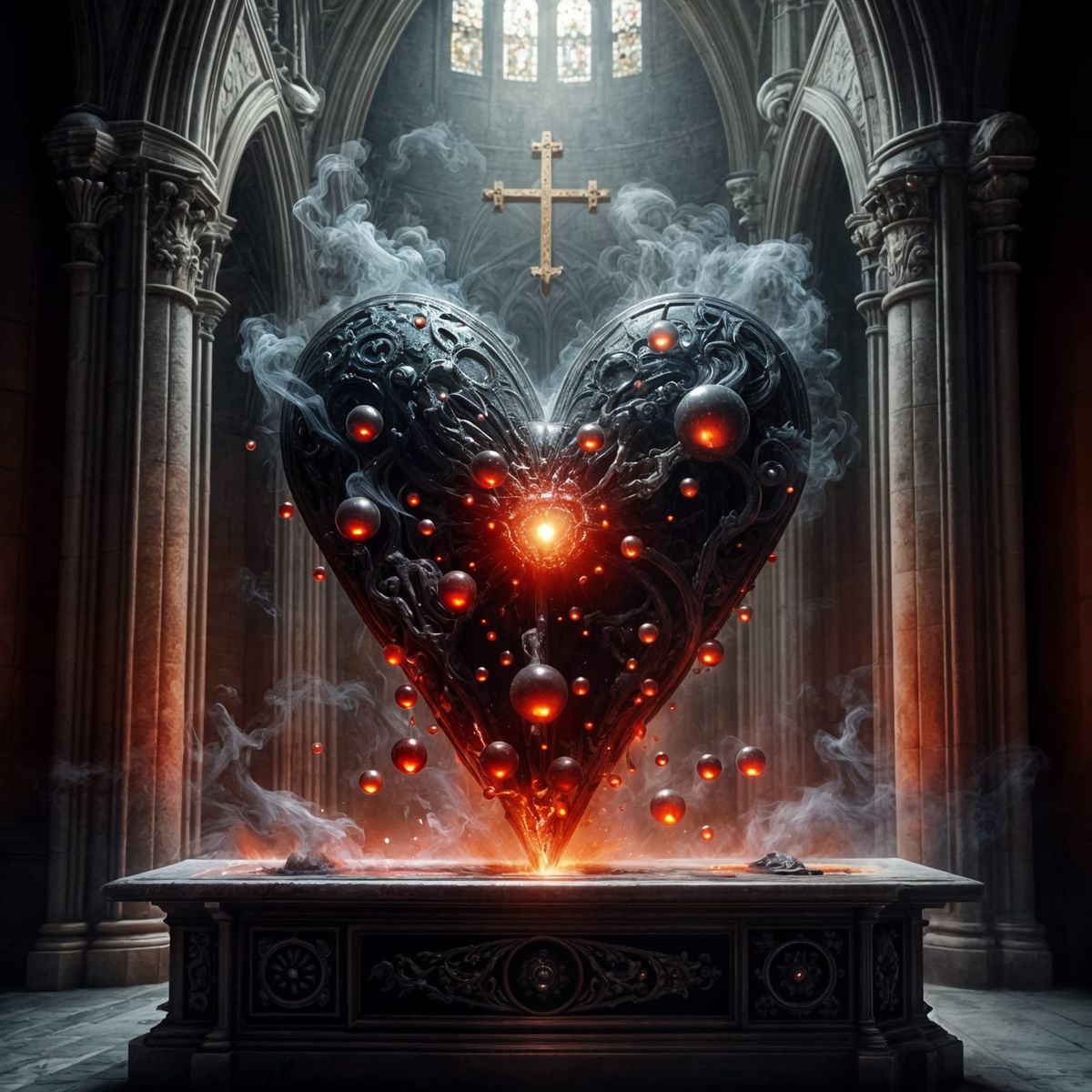 This image depicts a black and red heart shape pulsing with dark energy on a gothic altar in a ruined cathedral. The dramatic lighting casts long shadows, creating a striking visual effect in this digital painting.
