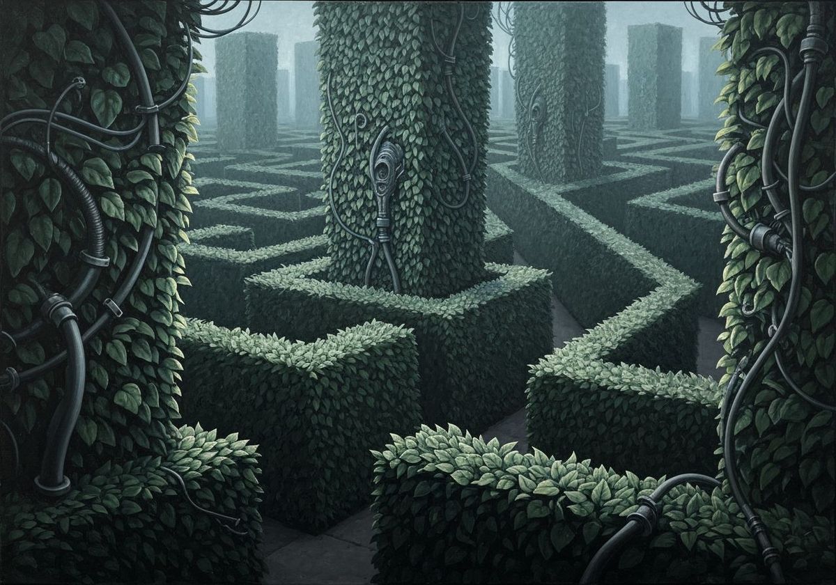 A surreal oil painting of a labyrinthine hedge maze. The artwork evokes the nightmarish biomechanical style and the impossible geometry.
