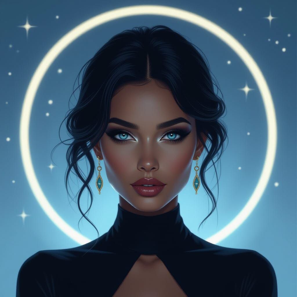 This image features a woman with striking black light skin, dressed elegantly. She has intense, deep eyes and is surrounded by shadows and starlight, evoking a cosmic and mystical feel.