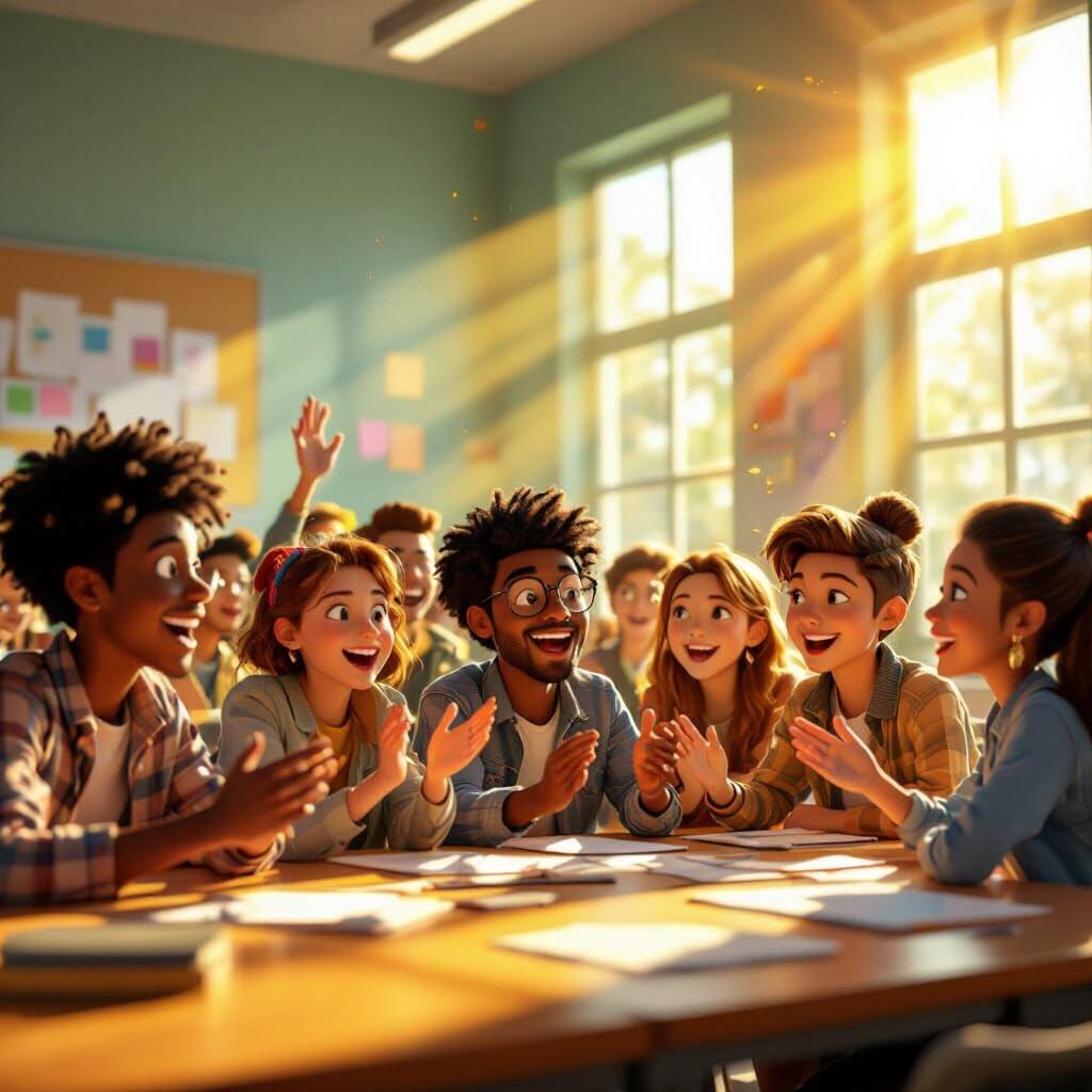 This image shows diverse, enthusiastic students in a vibrant, sun-drenched classroom. Rendered in a detailed 3D digital art style, it features warm colors and cinematic polish.
