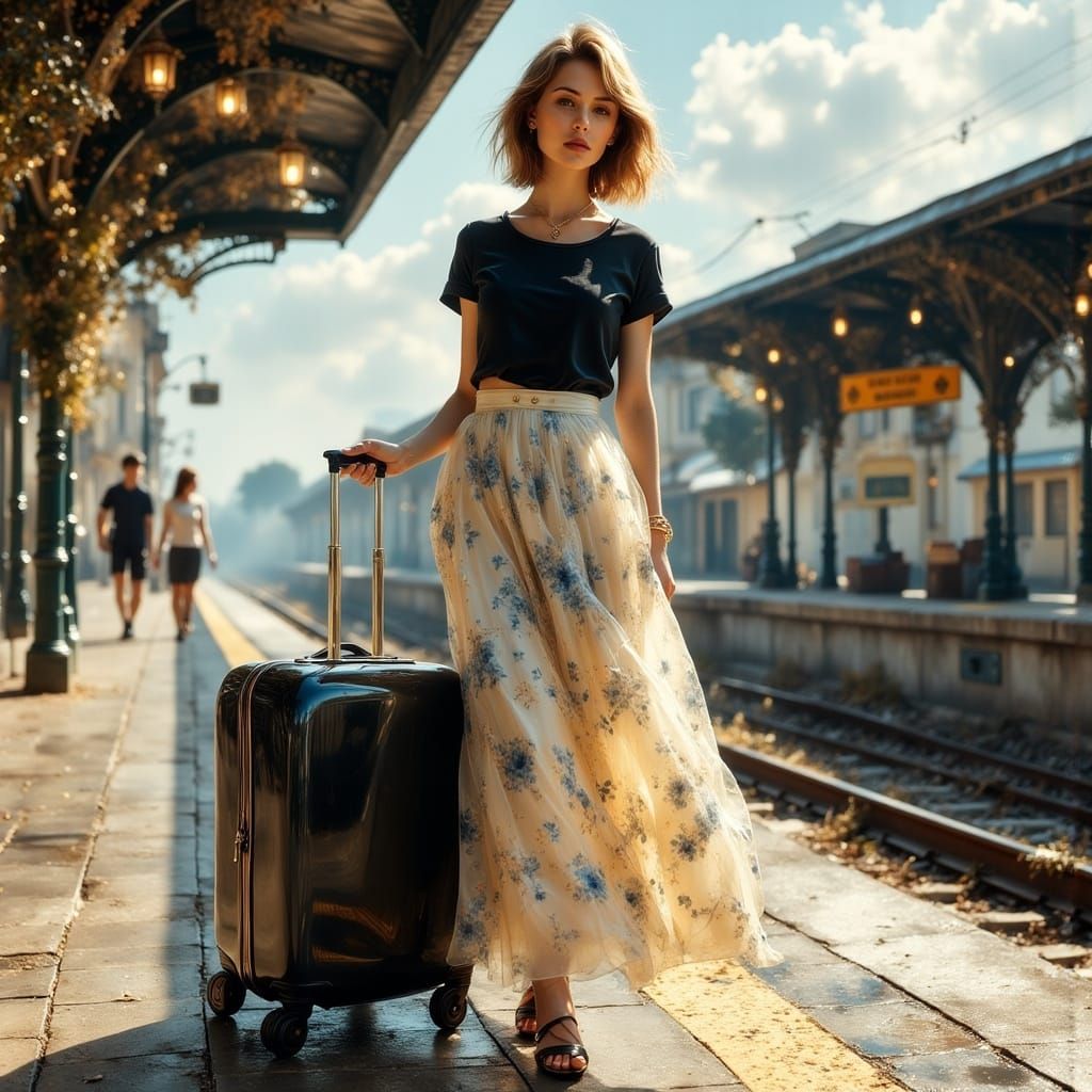 A realistic image portrays a woman with light brown hair on a train platform. She wears a black t-shirt, floral skirt, and sandals, holding a handbag and suitcase. The scene features natural lighting and visible textures.