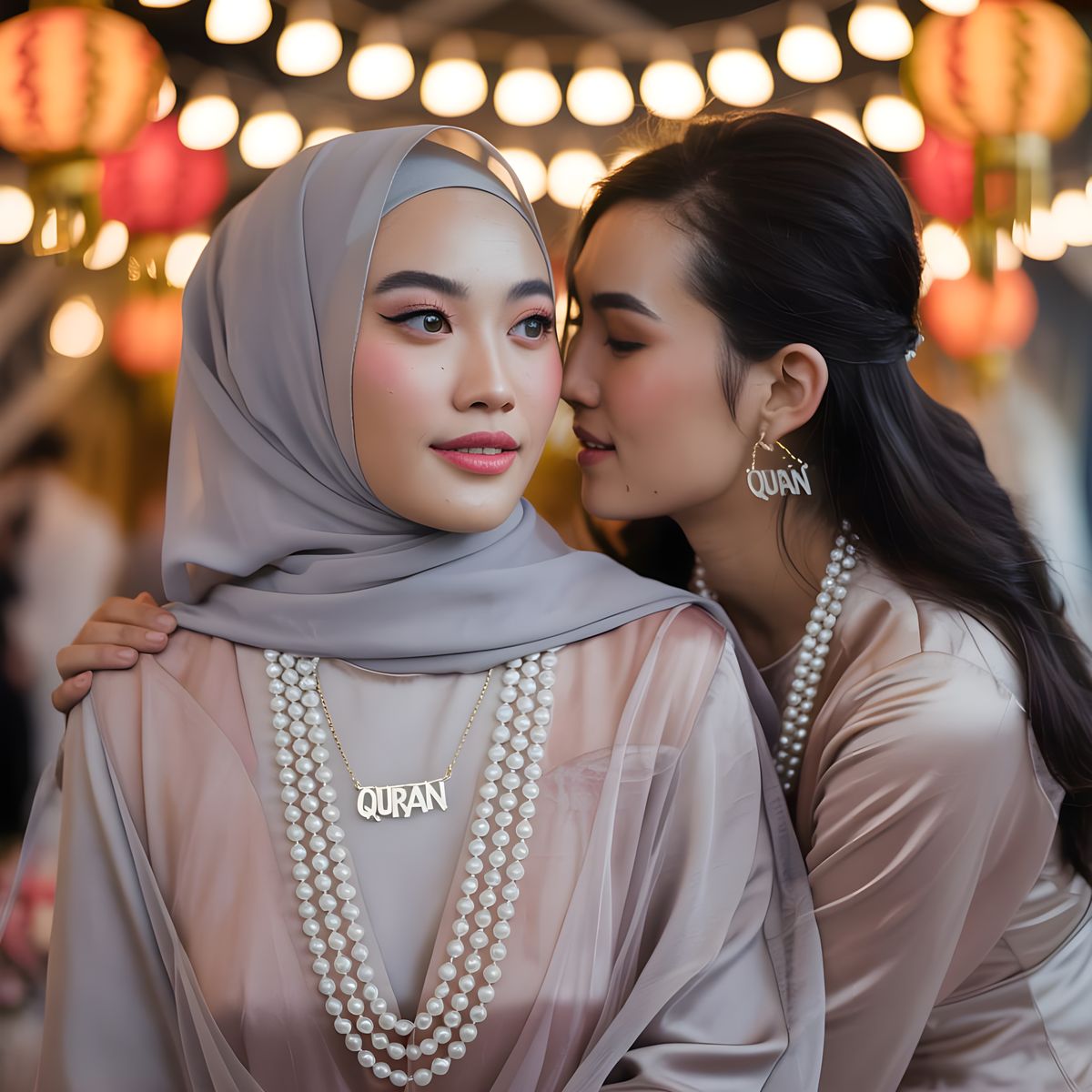 This image shows an Asian woman in a sheer dress and hijab adorned with pearl jewelry and a Quran necklace, kissing a bridesmaid at a wedding. The soft lighting and blurred background create a serene, spiritual atmosphere.
