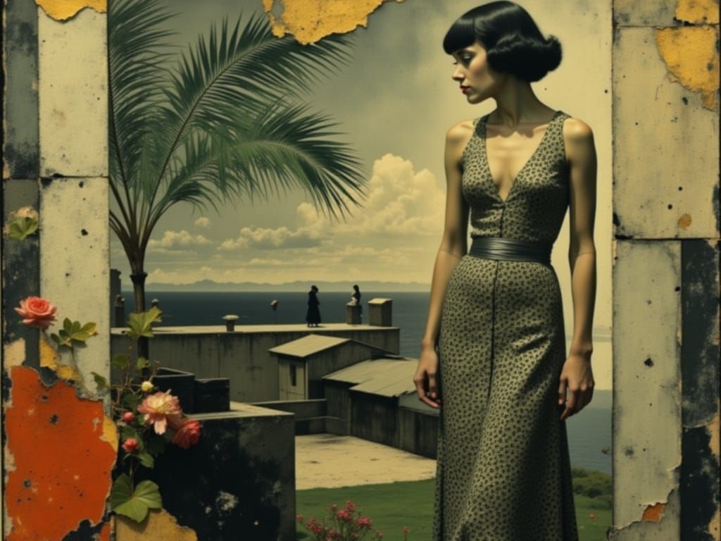 A digital matte painting of a nightclub singer in Art Deco style. The image features a textured, three-dimensional floral garden with black, white, and gold accents, reminiscent of 1940s geometric art.