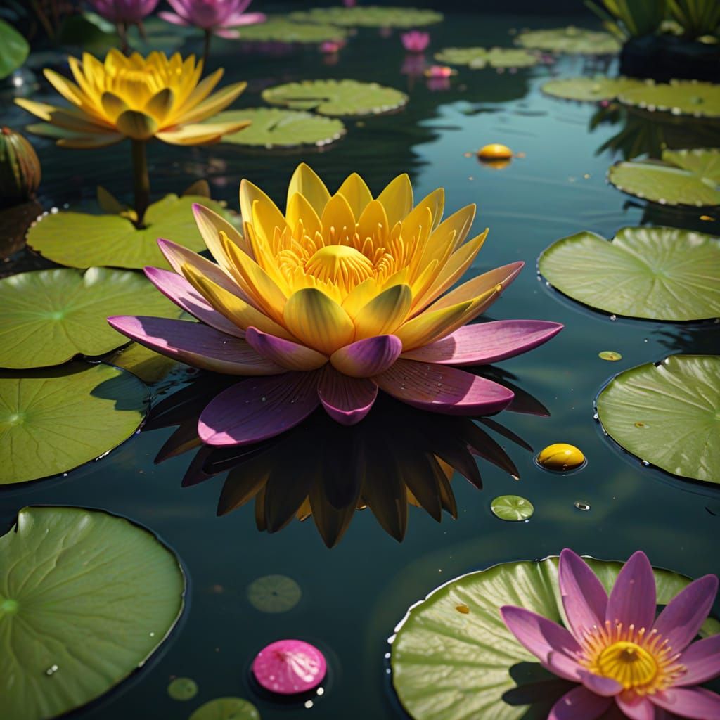 This image shows a mesmerizing surreal scene featuring a yellow water lily and a miniature figure in a pink dress, set amidst vibrant neon accents and glowing purple hues.