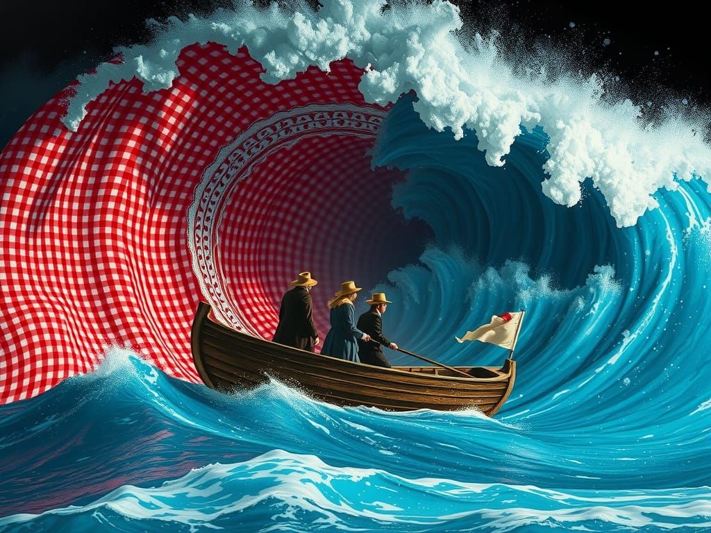 This image shows a group of people clinging to a small wooden boat amidst a massive gingham wave, with dramatic chiaroscuro and hyperdetailed texture.