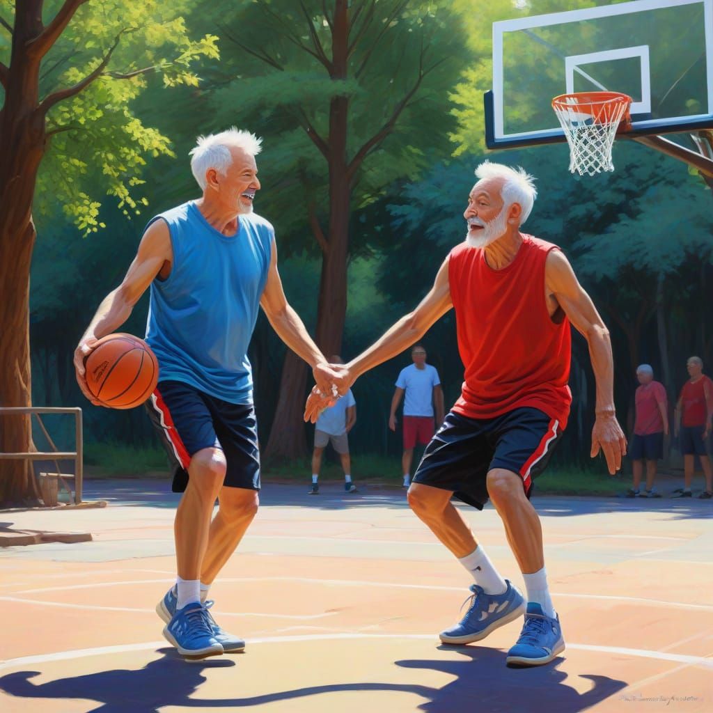 This image shows two elderly men joyfully playing basketball at sunset. The scene captures a sense of energy and defiance against age, depicted with thick brush strokes in an expressionist style.