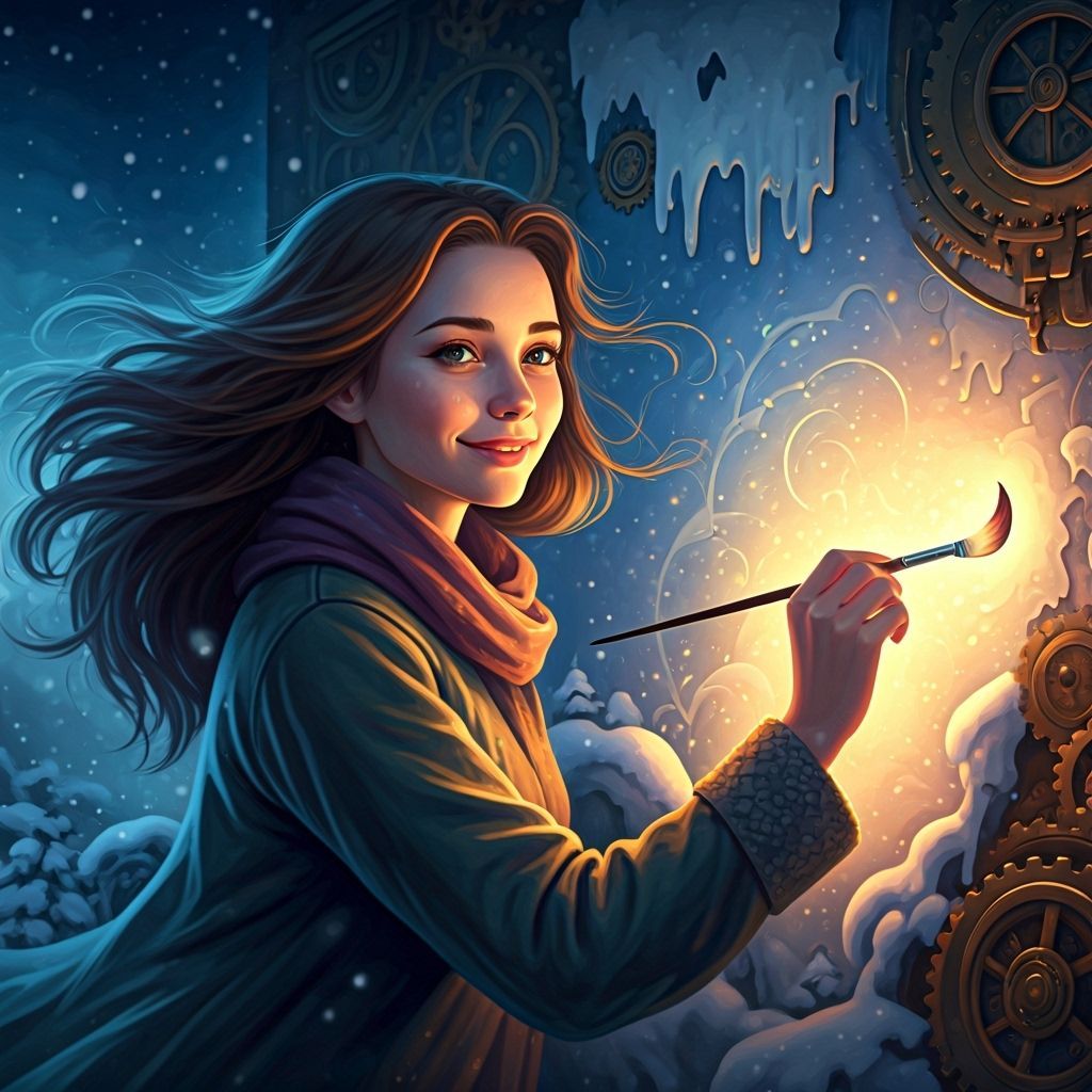 This image depicts an artist creating a magical winter scene on a house wall, using a light-emitting brush. The artwork blends New Year's magic and warm light, rendered in a style evoking 19th-century academic painting with surreal undertones.