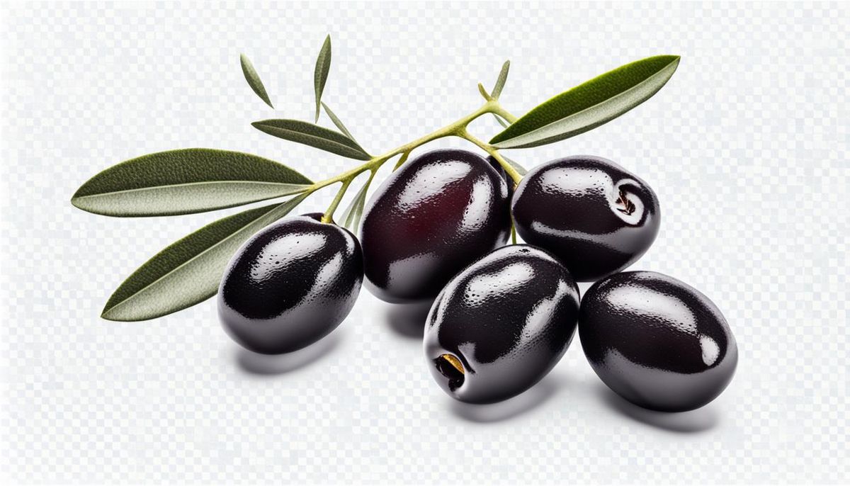 This image shows black olives with leaves isolated against a clean background. The photograph features a shallow depth of field, natural lighting, and sharp focus, mimicking professional DSLR photography.