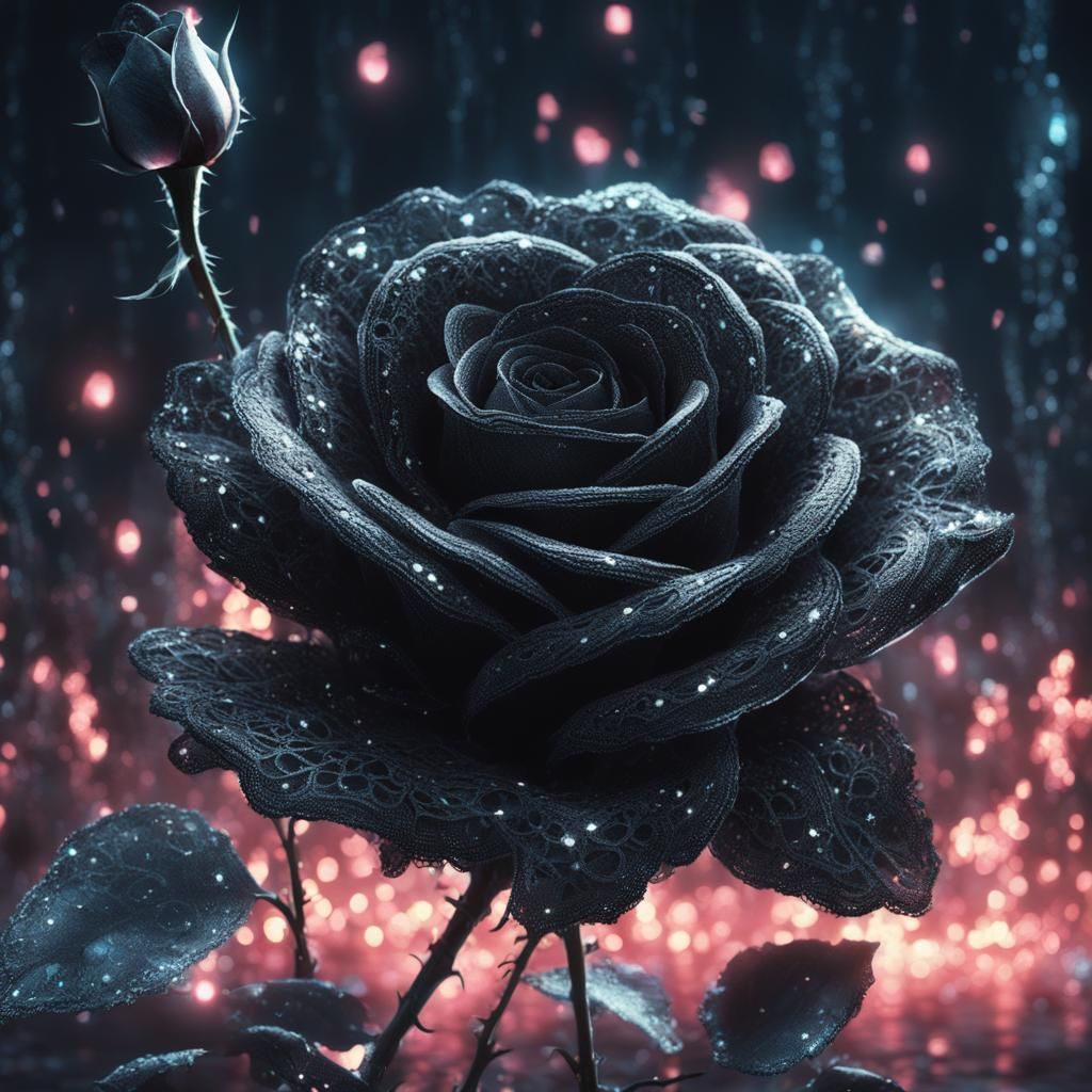 A hyperrealistic image of a magical rose made of sparkling black lace, set in a fantasy space. The image is rich with detail and uses dramatic lighting to highlight the rose.