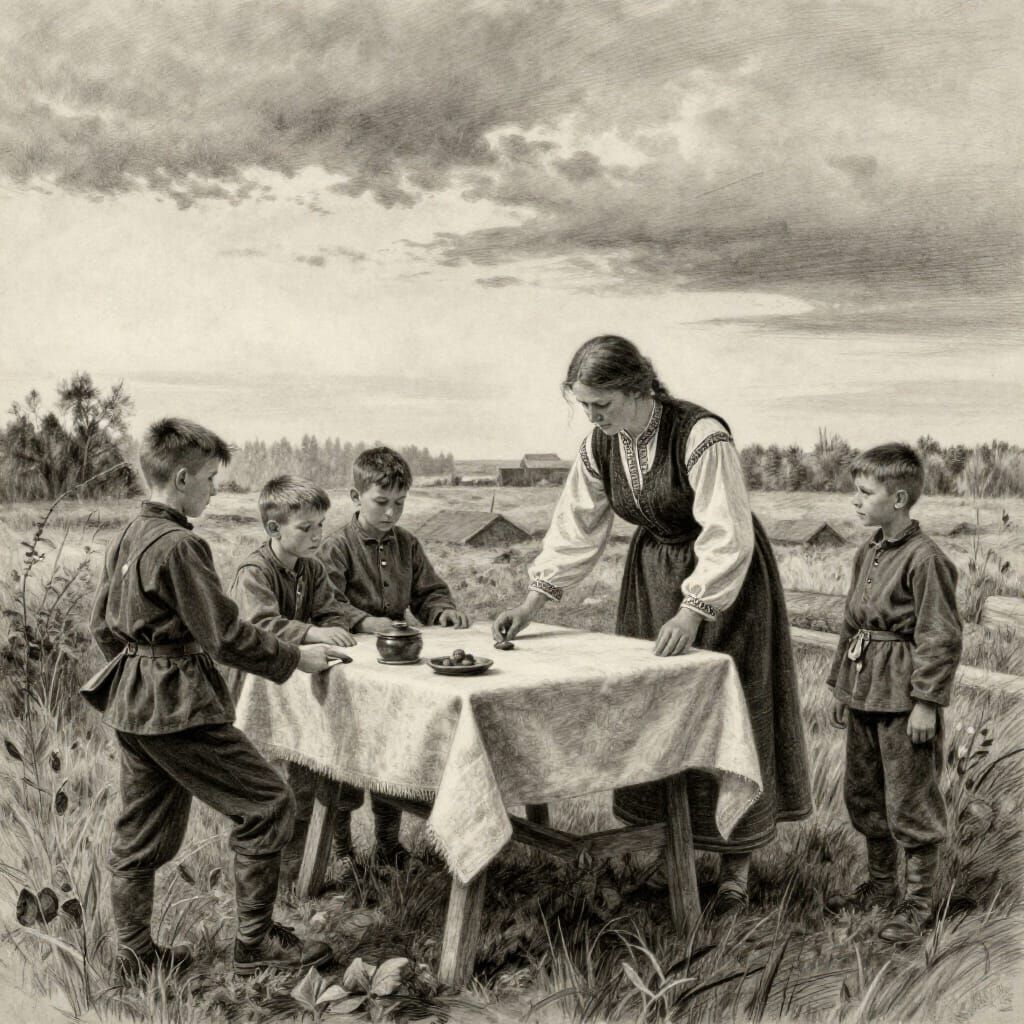 This image shows a hyperdetailed charcoal drawing of a Belarusian partisan homeland on a clear morning. A woman in traditional attire sets a table for her sons, evoking patriotism and resilience with soft, diffused light.