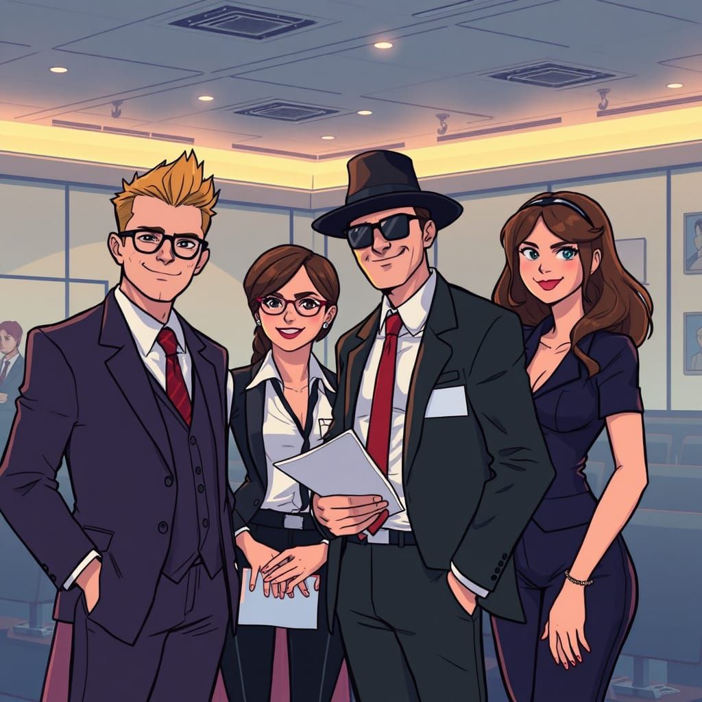 This image shows a meeting of four professionals in a climate-controlled conference room. The scene is reminiscent of a Loish animation, inspired by Glen Keane and Ian McQue, rendered with deep shadows and vibrant colors.