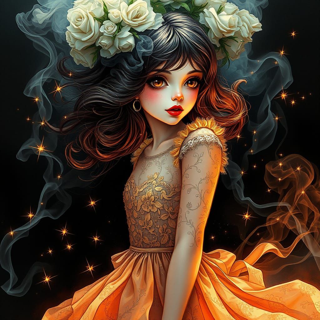 A gothic pen and ink drawing of a translucent girl in a lacy dress, surrounded by dark smoke and luminous sparks. The surreal fantasy art is highly detailed and vibrant.