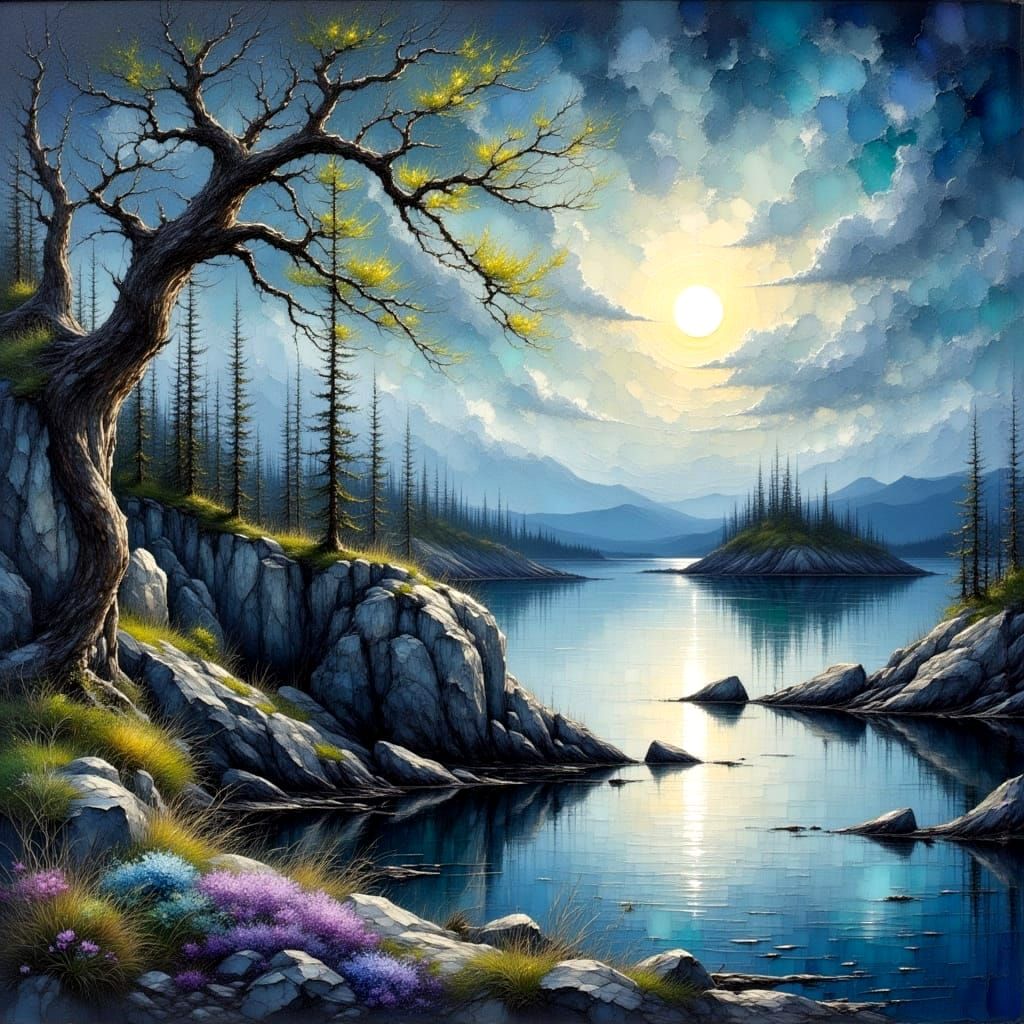 This image captures a serene and atmospheric harbor scene in Newfoundland, Canada, during the spring season. The artist's use of impasto techniques and muted colors creates a sense of depth and tranquility, reminiscent of a traditional oil painting with textured brushstrokes.
