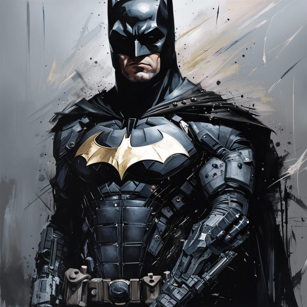 A striking portrait of Batman in a dark and sinister mood. The image is a photorealistic digital oil painting with a cinematic and atmospheric quality.
