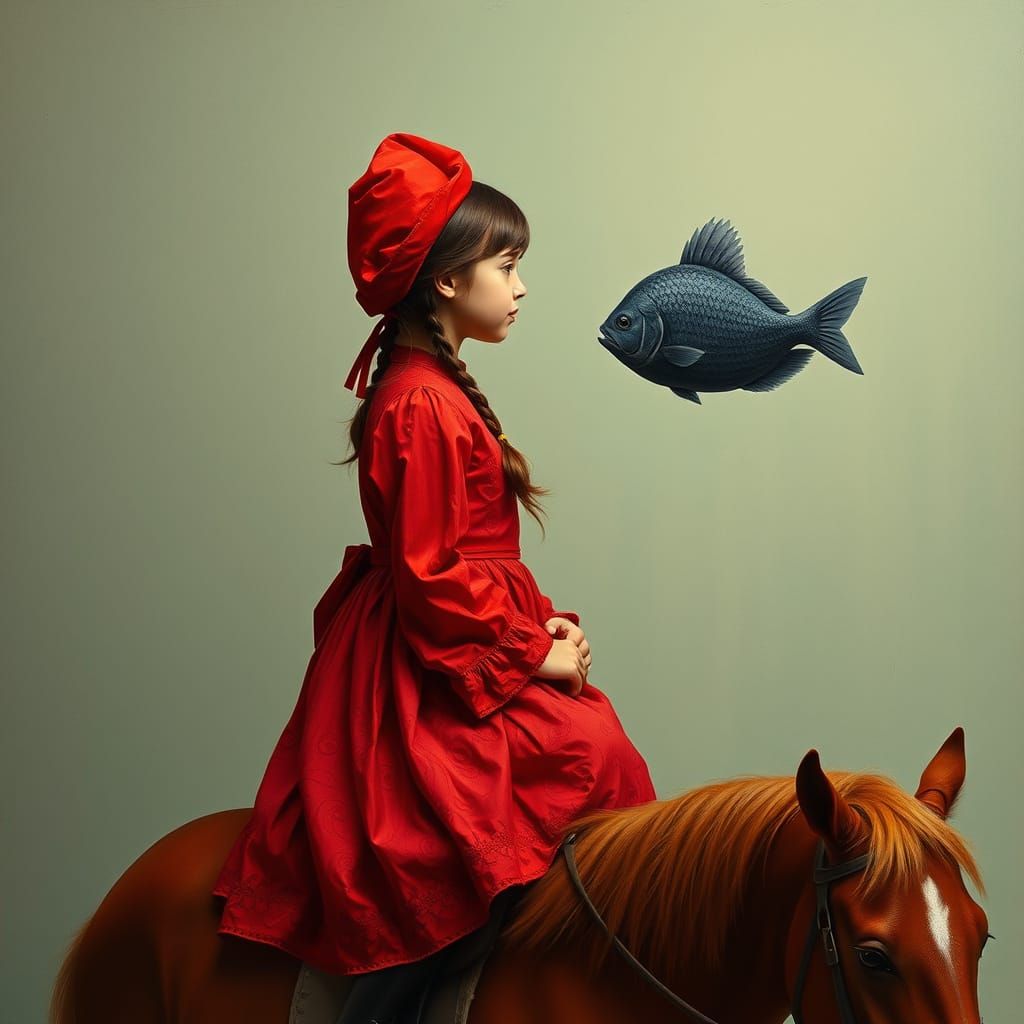 hyperrealistic portrait, girl in profile, wearing a long-sleeved, vibrant red dress, with a pointed red bonnet. She has braided brown hair. She is seated atop a large, solid red horse. The horse and the girl are the same shade of vibrant red. A large, dark gray/black fish floats in the air above her. ...