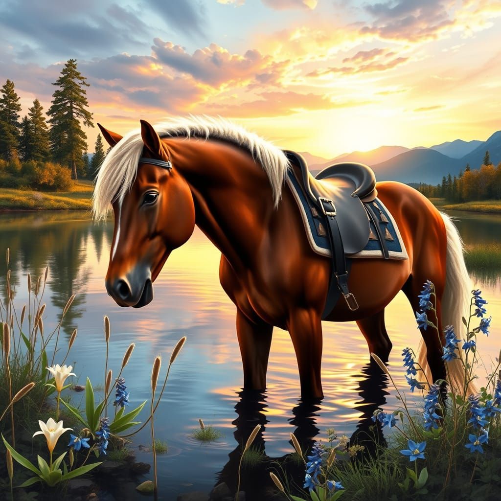 HDR, airbrushed, soft brush strokes, painterly, wet watercolor of a sunset over a calm lake, with mountains reflecting perfectly on the water. A beautiful, magnificent Mustang horse, his head bent down, drinking water from the lake. Willow trees and bog lilies growing along the banks of the lake, in ...
