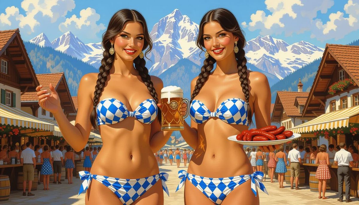 Two voluptuous women with dark braided hair in diamond-patterned bikinis at Oktoberfest. One carries beer steins, the other sausage, with a festive village and mountains behind them, rendered in a dramatic fantasy art style.