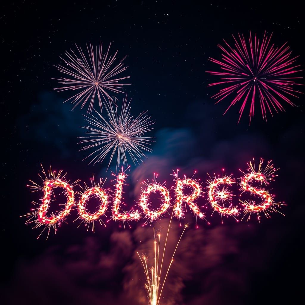 This image shows the name "Dolores" written in vibrant, dynamic fireworks. The letters are formed from bursting colorful pyrotechnics against a starry night sky, captured with long exposure.