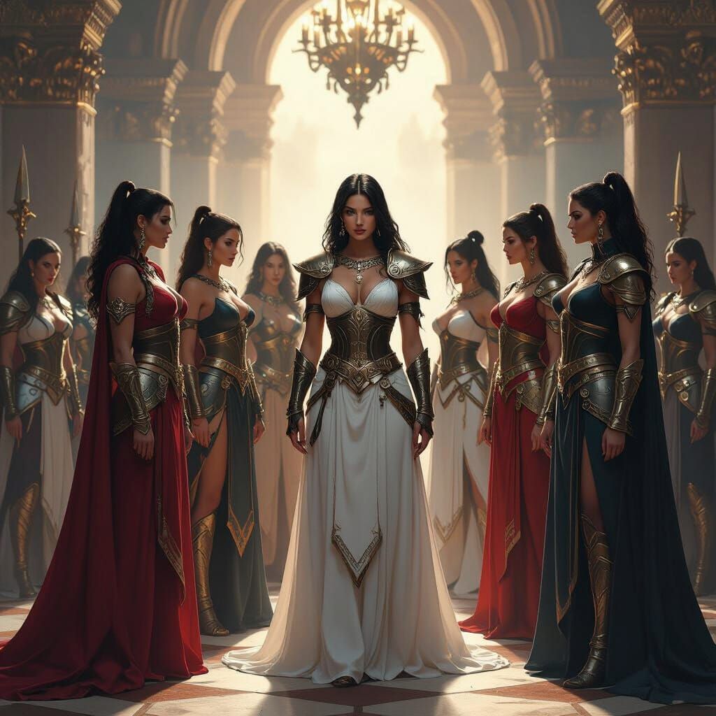 This image depicts strong, mature women in elegant warrior garb showing deep respect to a regal war king. Rendered in an epic fantasy art style with dynamic lighting and rich jewel tones.