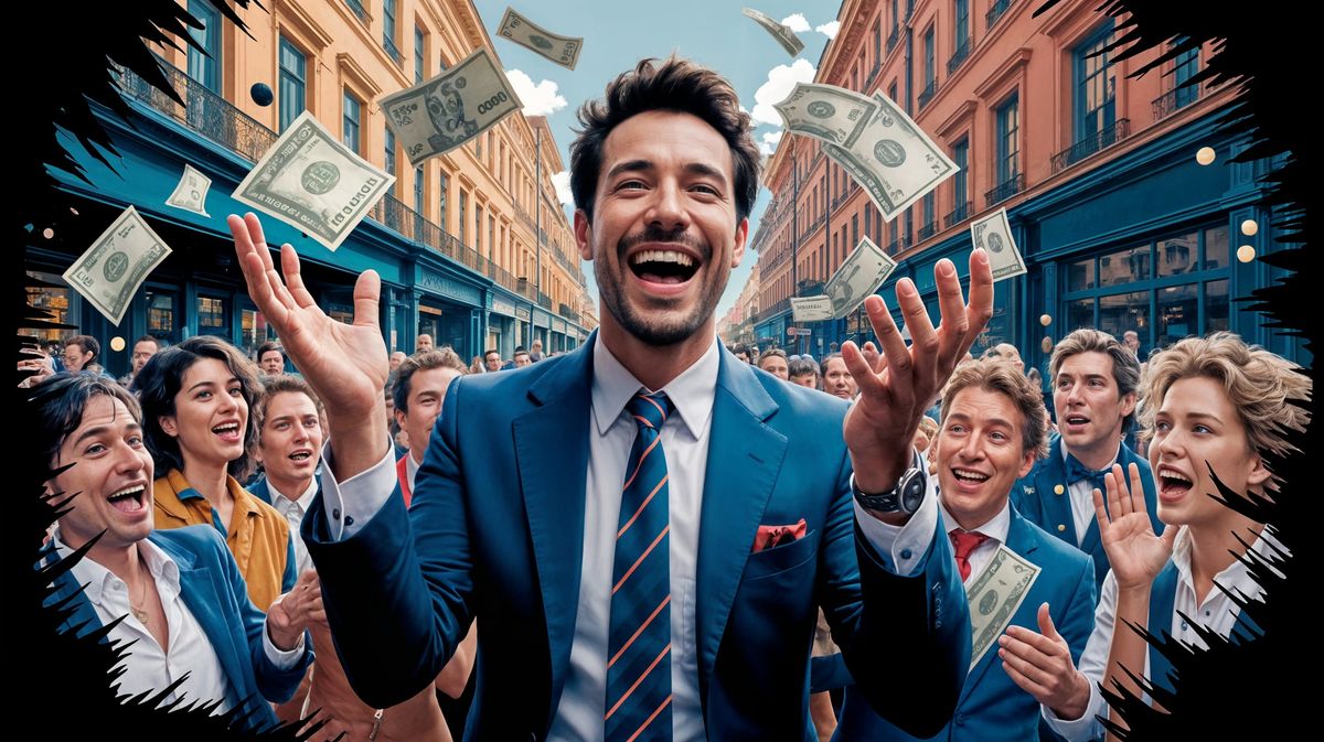 This image shows a dynamic street scene in a highly detailed digital art style, reminiscent of Moebius and WLOP. A joyful man throws banknotes into the air, surrounded by a crowd with amazed expressions, in a warm and inviting atmosphere with vivid triadic colors and subtle paint drops.