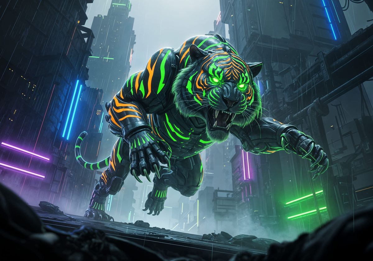 This image shows a helltiger with striking neon green and orange coloration. The creature's design is bold and eye-catching due to its vibrant color scheme.