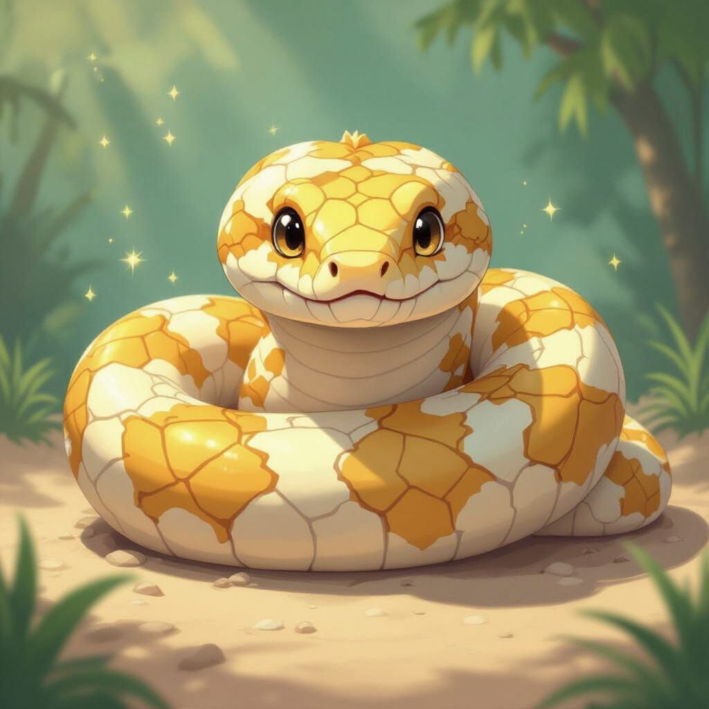 This image showcases a giant python with bright gold and pearly white scales arranged in triangular patterns. The artwork features pastel accents and soft lighting in a Hayao Miyazaki style.