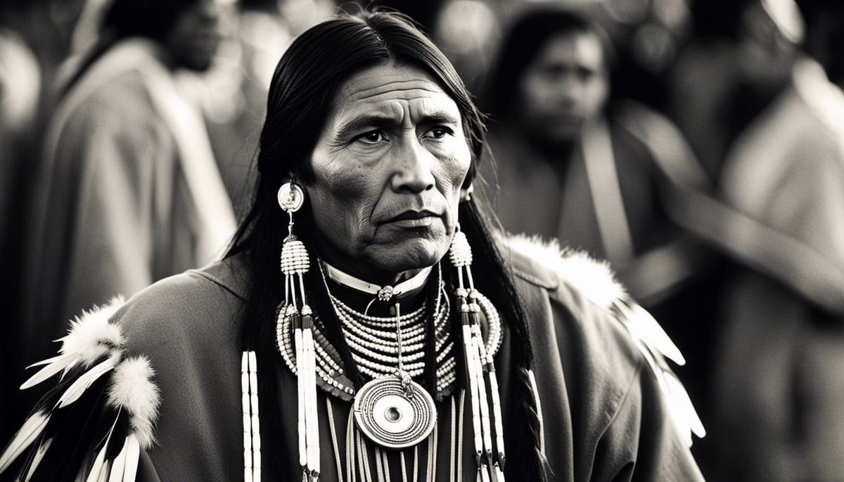 A striking black and white photograph of Native Americans performing a pow wow dance in 1900. The full body shot features detailed facial features and atmospheric lighting.