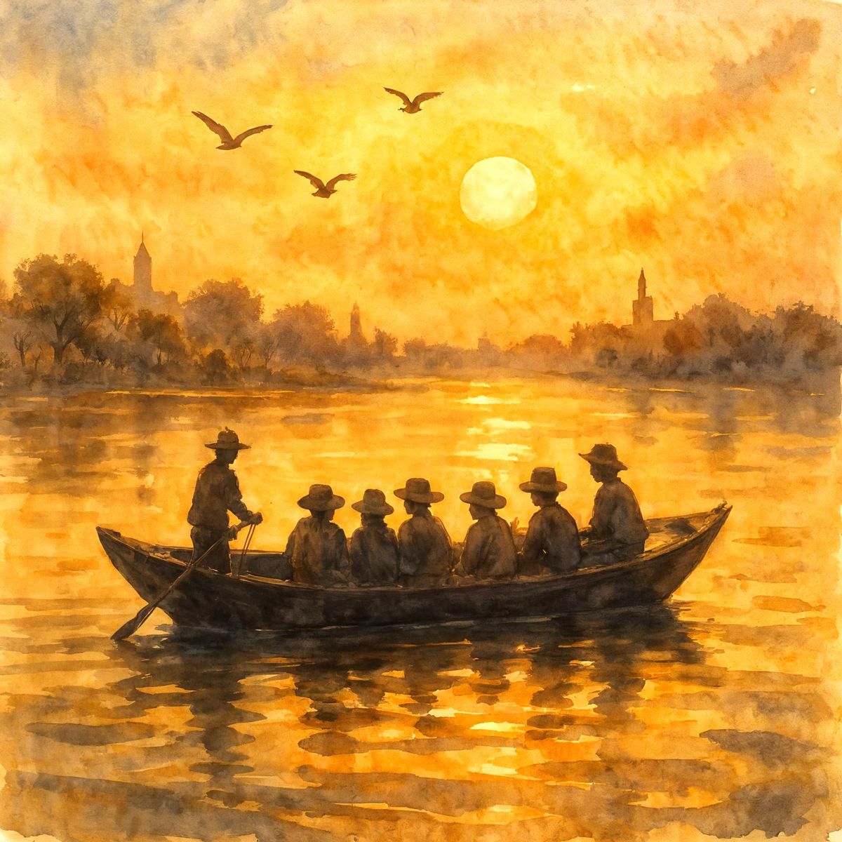 A watercolor painting shows a small boat sailing on a river at sunset. The warm light creates shimmering reflections on the water, with birds flying towards the sun in a serene atmosphere.